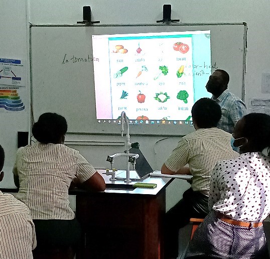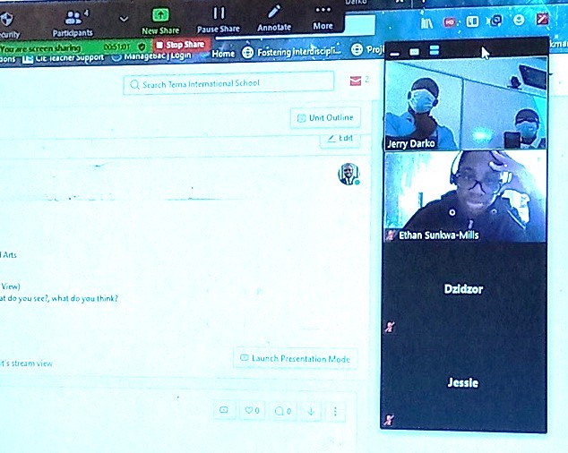 All students at home and at school had to join in. In one session this week, it was great to hear our offsite students over the class speakers discussing disciplinary understanding. Above on the right, offsite students Malik Nyanin in the UK and Ohemaa Asibuo in Accra are seen on Mr Louis’ laptop joining in a Grade 10 IDU activity on the first day. On the left, in another session, Grade 9 students at TIS could hear their mates Jeremy Sunkwa-Mills in Qatar, Dzidzor Mac-Deh and Jessie Ofori-Appiah in Accra putting forward their views on their set IDU activity.