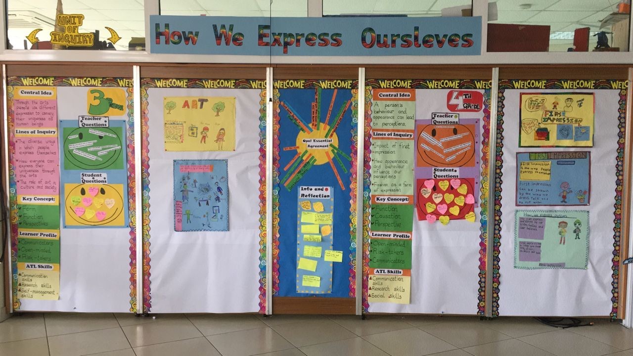 The use of display boards: Display boards are a great way to get our students engaged, excited and working together, helping to maximize learning and personal skills. Additionally, display boards are a great learning tool for children who are visual learners. Display boards provide information on the unit of inquiry and also show students’ work. Displaying students’ work creates a feeling of belonging and also motivates students to work harder.