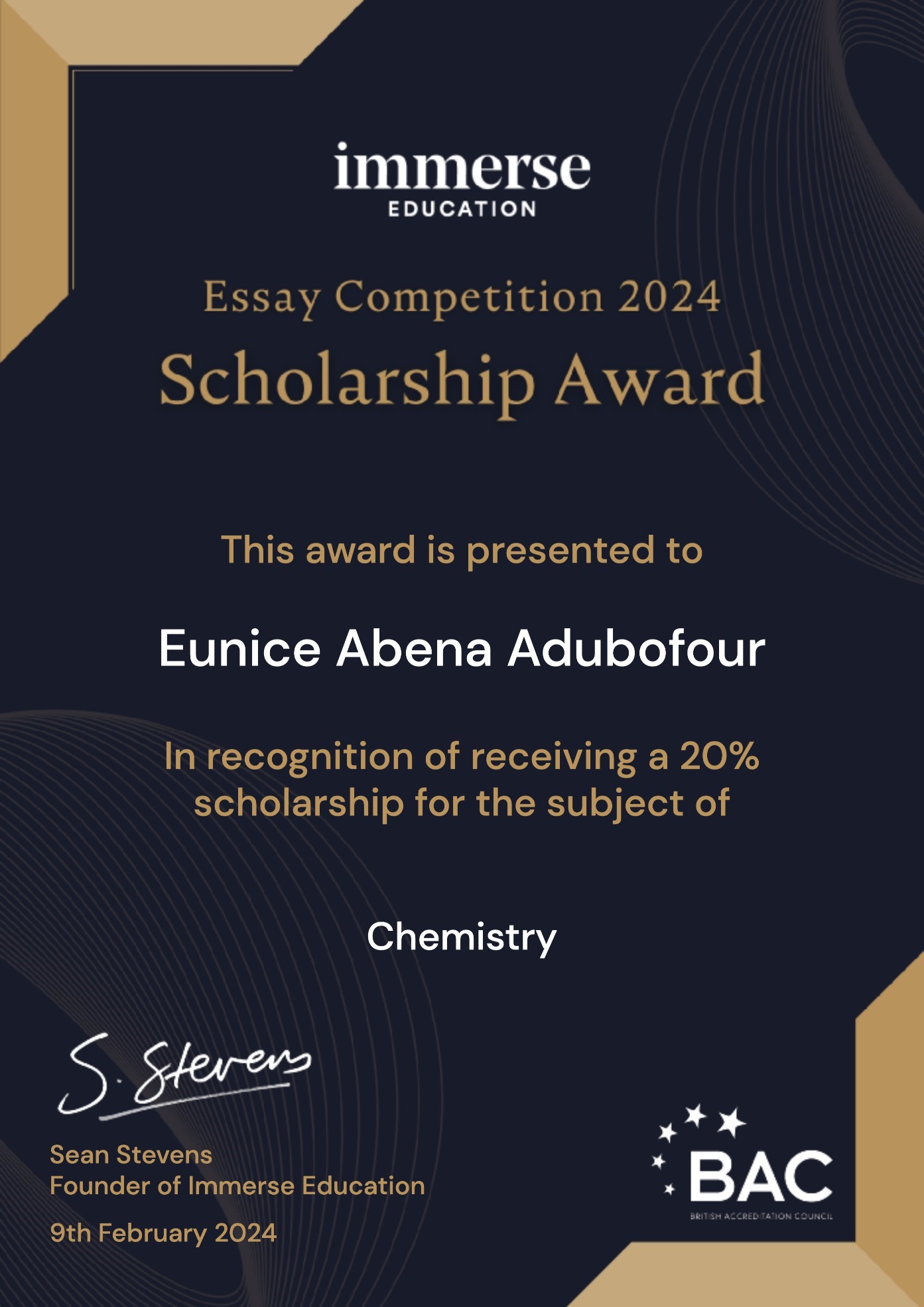 Throughout the competition, I deepened my understanding of fundamental concepts in chemistry and biology, specifically exploring how the structures of organisms facilitate life’s essential functions. Crafting the essay demanded critical thinking, extensive research, and the ability to articulate my thoughts clearly. Earning a 20% scholarship for a summer program, coupled with a certificate, is an honour I attribute to the grace of God—an acknowledgement of my dedication and hard work.